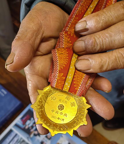 黄大发爷爷还展示了他获得的诸多勋章与奖牌,其中最为“沉甸甸”的,当属中国共产党成立100周年“七一勋章”,师生们在感受其重量发出感叹的同时,似乎还感受到了黄大发爷爷骄傲的神态。